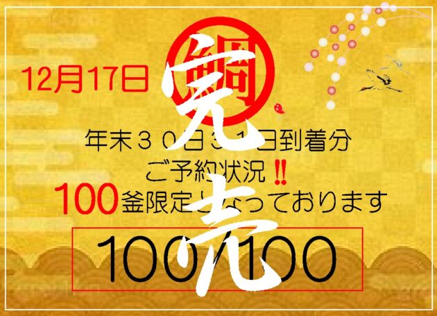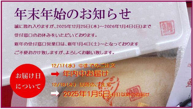 2025.12.17 お歳暮 鯛の塩釜焼きお届け年末年始のお知らせ!年内お届けのご注文は終了いたしました、ご注文ありがとうございました。 年末年始のお知らせお届け日につきまして12 / 17(水) 中までのご注文 ➡ 年内中お届け12 / 18(木) 以降のご注文 ➡ 2026年1月5日(月)以降のお届けとなっております。 年内お届けに関しまして ご注文お届け分完売年内お届け御注文受付終了致しました。 ご注文ありがとうございました。 2026年もよろしくお願いいたします。